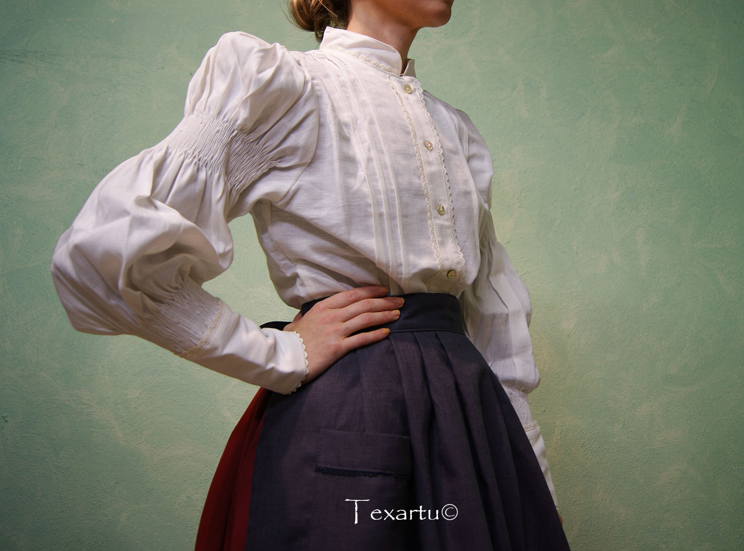 Delantal de lino con trabajo de palas, cinturilla ancha, lorzas y dos bolsillos en delantero. Adorno de puntilla a tono o en contraste en lorzas y bolsillos. Largo 75cm.