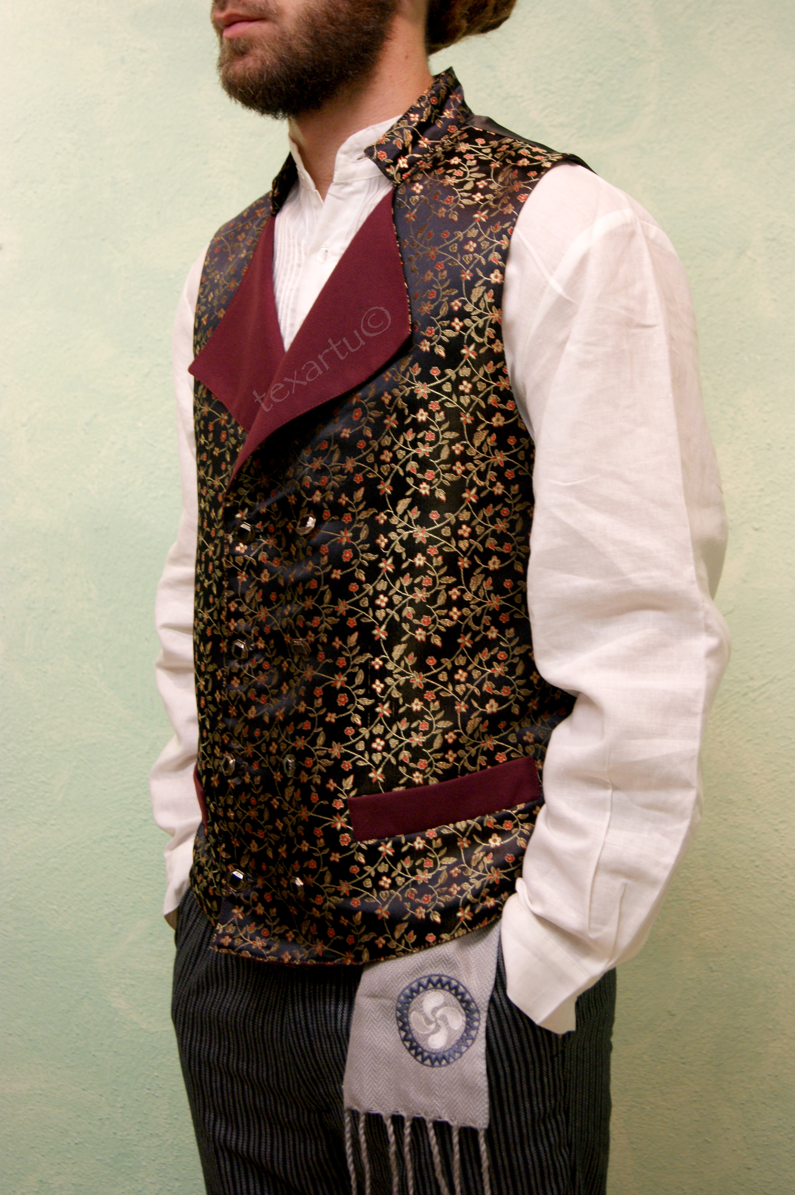Chaleco brocado con cuello solapa y doble abotonadura.